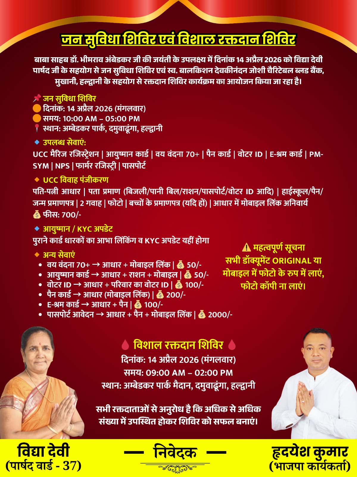 हल्द्वानी। दमुवाढूंगा क्षेत्र में अंबेडकर जयंती के अवसर पर 14 अप्रैल 2026 को एक विशाल रक्तदान शिविर का आयोजन किया जा रहा है।