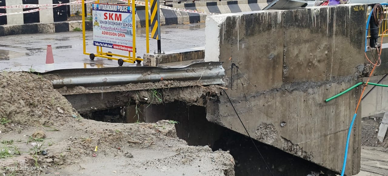 शनिवार रात हुई तेज वर्षा के बाद हल्द्वानी में गोला पुल की ओर जाने वाली एप्रोच सड़क का एक हिस्सा फिर से धंस गया, जो पूर्व में भी इसी तरह धंसा था।