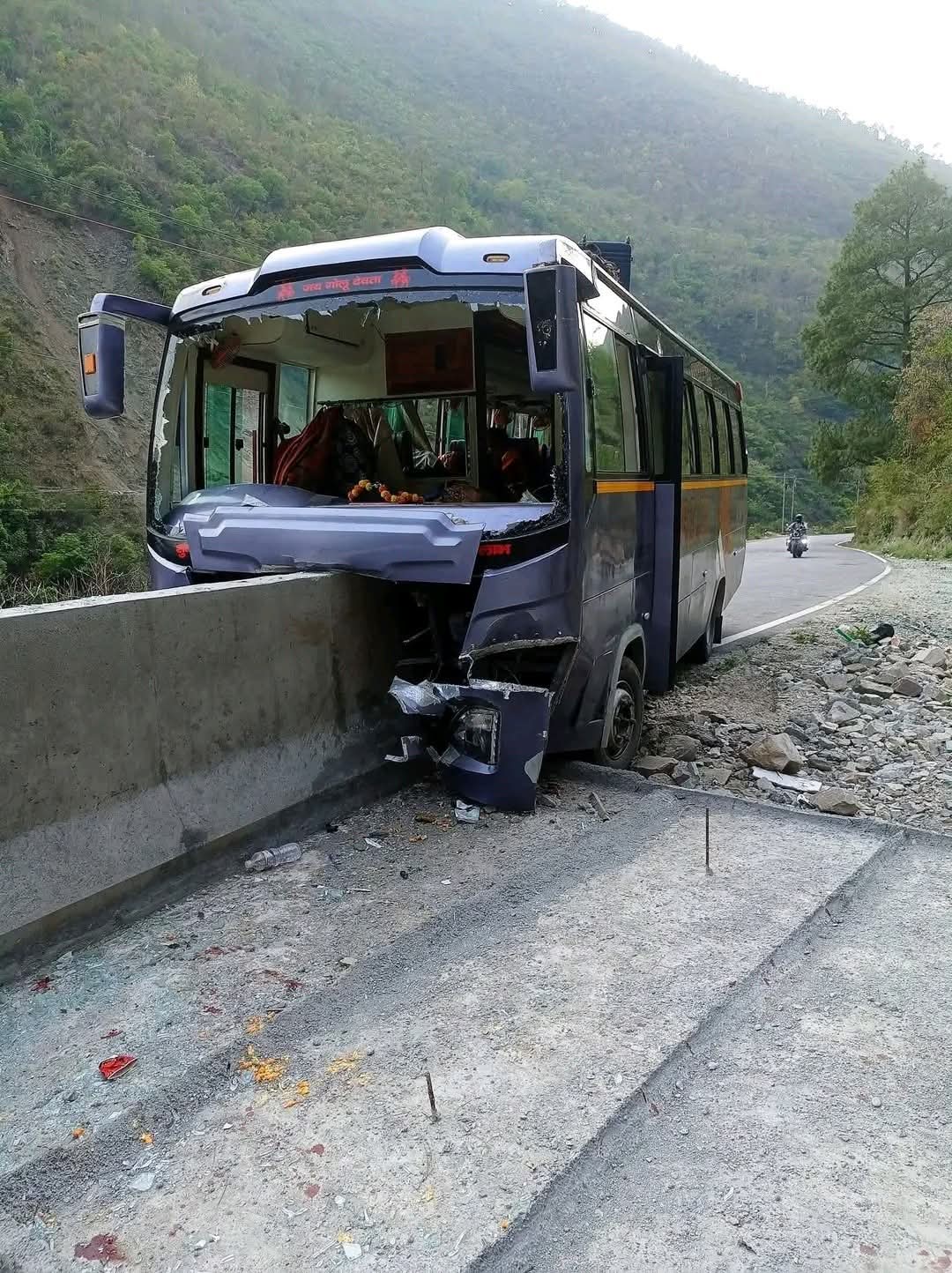 दोपाखी के समीप अल्मोड़ा से हल्द्वानी आ रही सैलानियों से भरी केमू बस अनियंत्रित होकर पैरापिट से टकरा गई। टक्कर इतनी जोरदार थी कि बस का एक हिस्सा बुरी तरह क्षतिग्रस्त हो गया और यात्रियों में अफरा-तफरी मच गई।