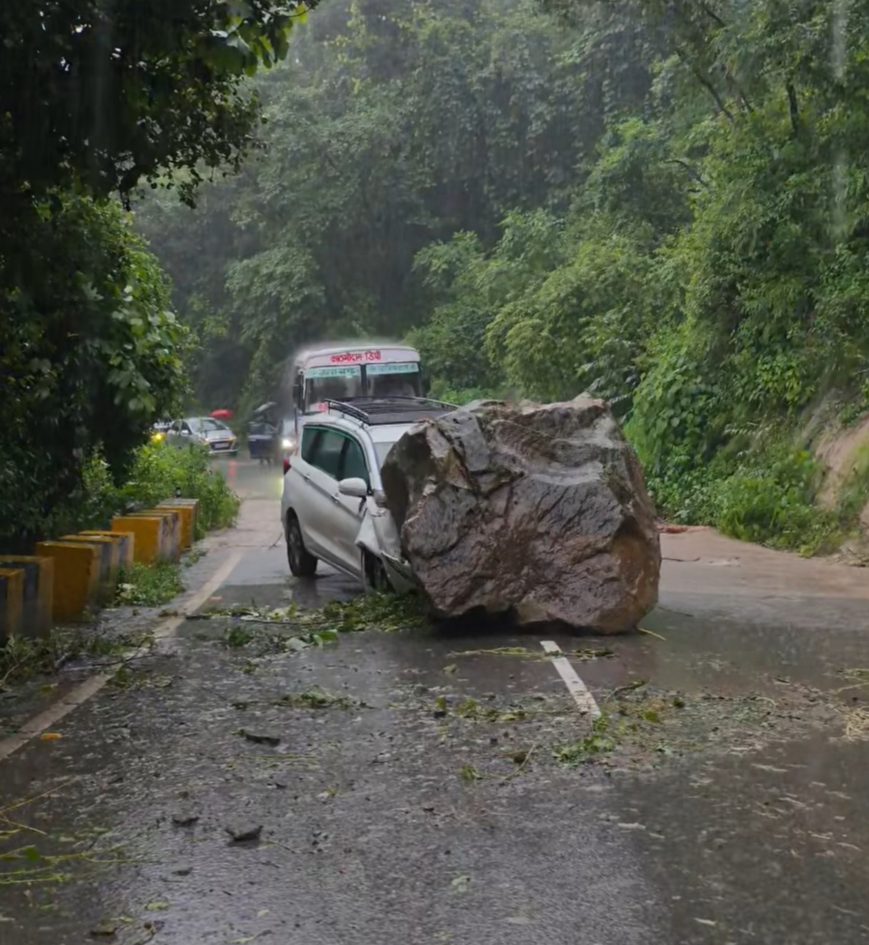 लेकिन गनीमत रही कि बोल्डर कार के किनारे से टकराया और बड़ा नुकसान होने से बच गया। हादसे के बाद मौके पर अफरा-तफरी मच गई।