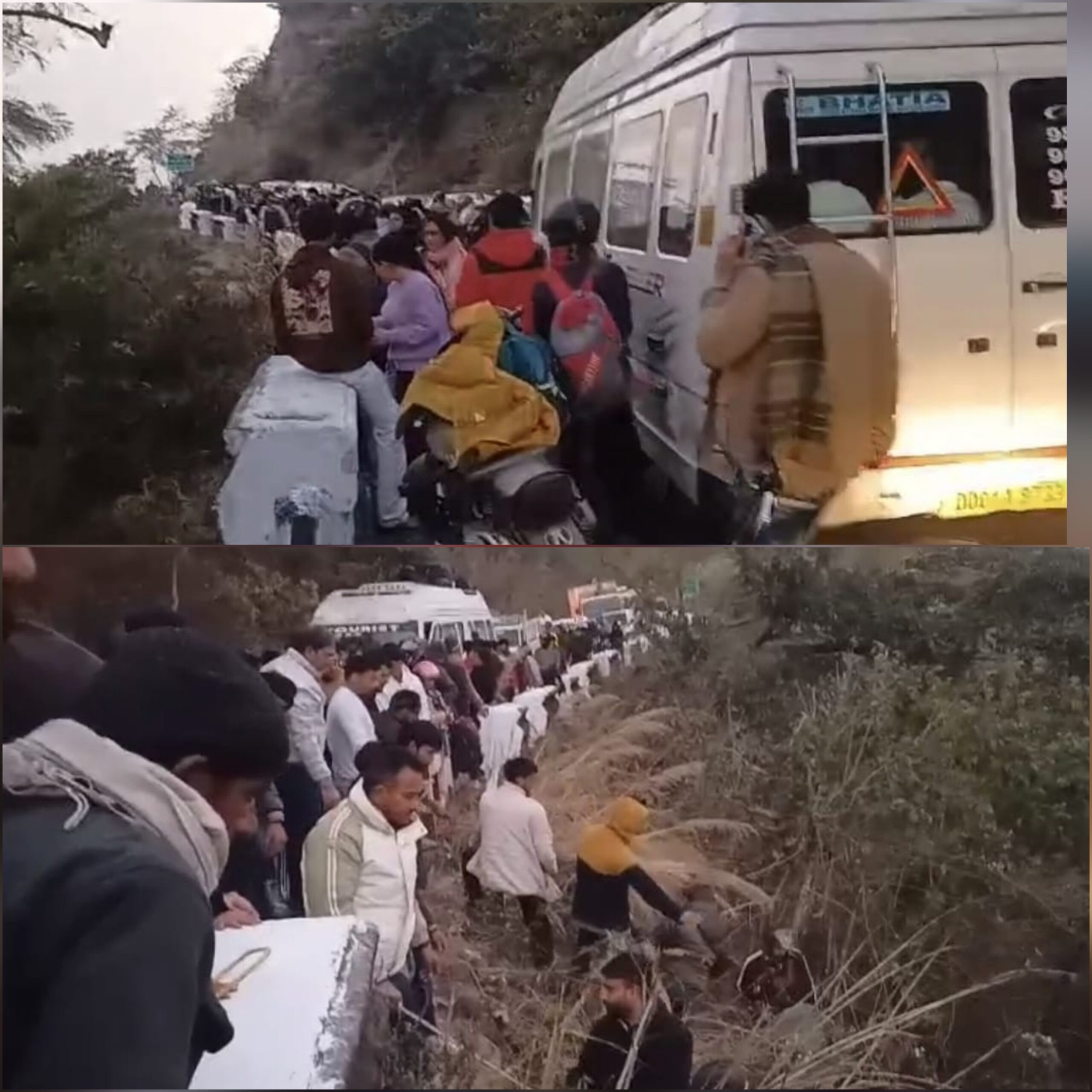 सफेद रंग की टैम्पो ट्रैवलर बस गहरी खाई में गिरने के बाद एक जगह अटक गई। मददगारों, एक मुश्किलों भरा रैस्क्यू अभियान चलाकर लंबी रस्सी के सहारे घायलों को सड़क तक लाए।