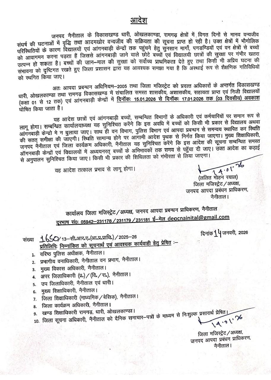 नैनीताल। विकासखण्ड धारी, ओखलकाण्डा एवं रामगढ़ क्षेत्रों में विगत कुछ दिनों से मानव-वन्यजीव संघर्ष की घटनाओं में वृद्धि तथा आदमखोर वन्यजीव की सक्रियता की सूचना प्राप्त हो रही है।