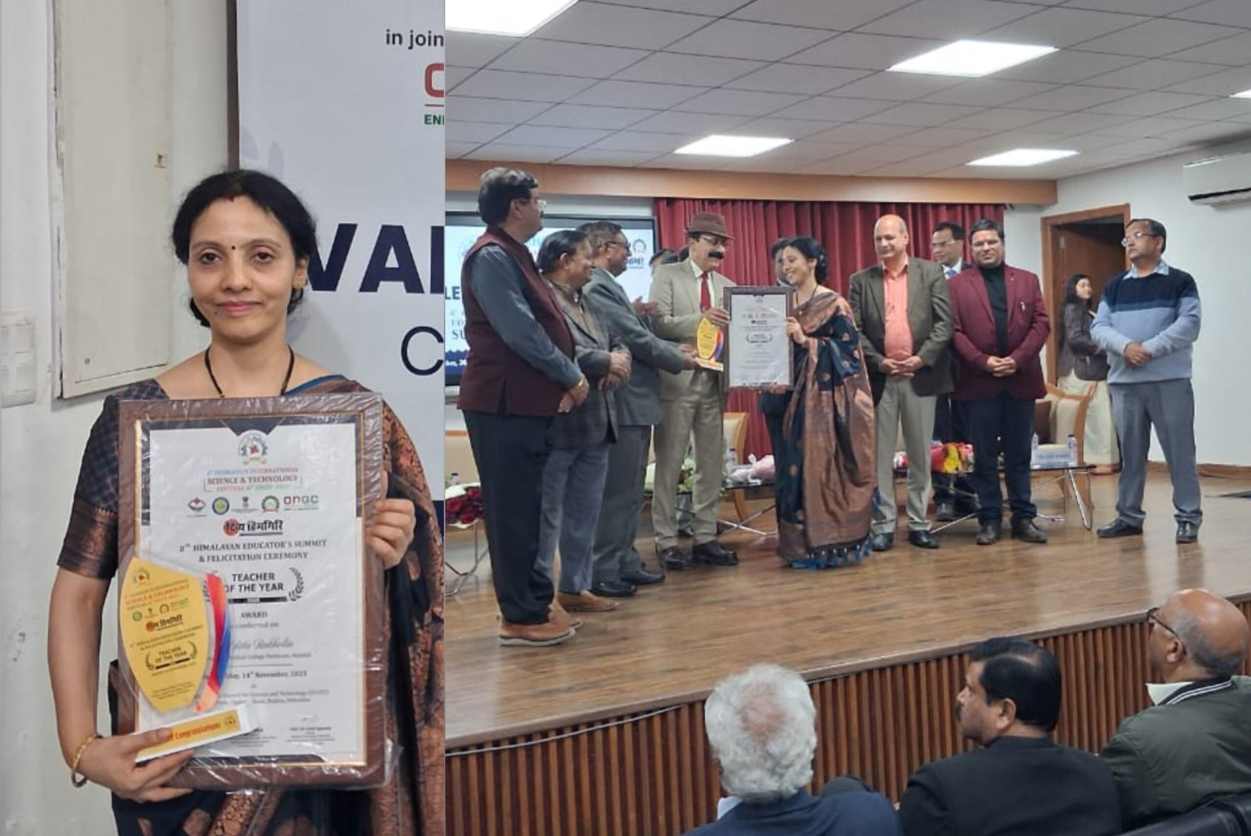 देहरादून। छठा देहरादून इंटरनेशनल साइंस एंड टेक्नोलॉजी फेस्टिवल देहरादून में डॉ ऋतु रखोलिया को टीचर ऑफ द ईयर से सम्मानित किया गया,, डॉ रखोलिया को प्रोफेसर देवेंद्र भसीन वाइस चेयरमैन, उत्तराखंड स्टेट हायर एजुकेशन काउंसिल, प्रोफेसर दीवान सिंह नेगी वाइस चांसलर कुमाऊं विश्वविद्यालय, प्रोफेसर ओ पी एस नेगी, फॉर्मर वाइस चांसलर उत्तराखंड ओपन यूनिवर्सिटी, प्रोफेसर मीनू सिंह डायरेक्टर आल इंडिया इंस्टीट्यूट ऑफ़ मेडिकल साइंस ऋषिकेश, प्रोफेसर अजय सक्सेना फॉर्मर प्रिंसिपलडी ए बी कॉलेज देहरादून द्वारा डॉ रखोलिया को प्रमाण पत्र एवं स्मृति चिन्ह भेंट कर सम्मानित किया गया। मुख्य अतिथि आई फ़ एस जय राज थे।
