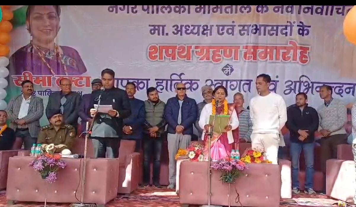 नैनीताल के भीमताल में नगर पालिका के नवनिर्वाचित अध्यक्ष और सभासद को निर्वाचन अधिकारी के एन गोस्वामी ने दिलाई शपथ