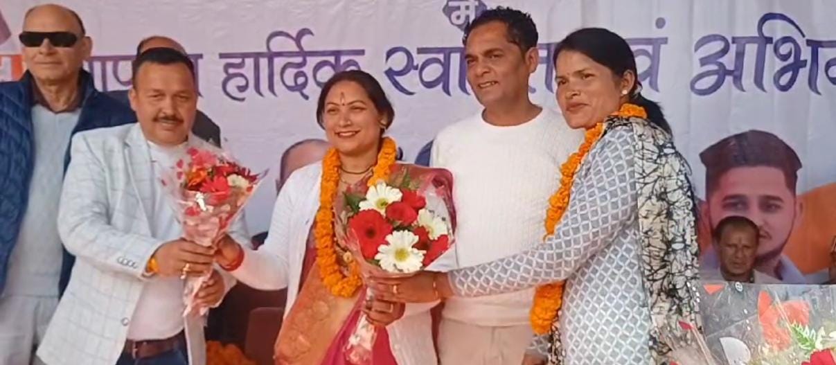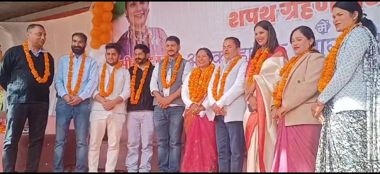 शपथ ग्रहण समारोह में नगर के वरिष्ठ नागरिक के साथ स्थानीय लोगो ने शिरकत की नवनियुक्त अध्यक्ष सीमा टम्टा के साथ सभी 9 वार्ड के सभासदों का फूल मालए पहनकर स्वागत किया गया।