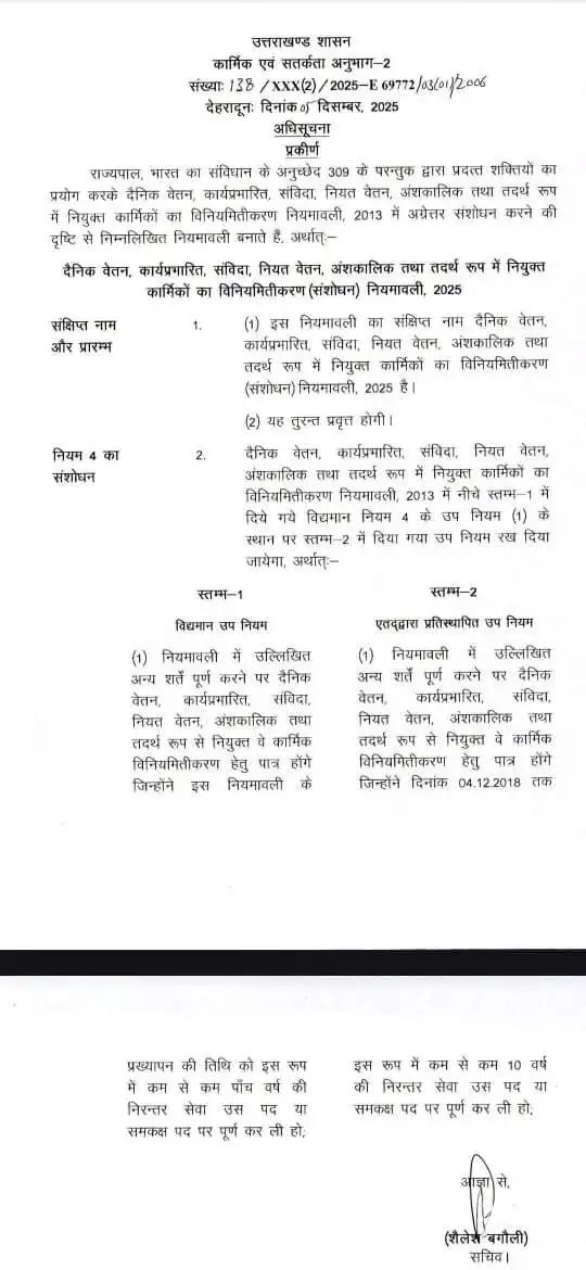 राज्य सरकार ने दैनिक वेतन, कार्यप्रभारित, संविदा, नियत वेतन, अंशकालिक रूप में नियुक्त कर्मचारियों को बड़ी खुशखबरी दी है। सरकार ने विनियमितीकरण संशोधन नियमावली 2025 की अधिसूचना जारी कर दी।