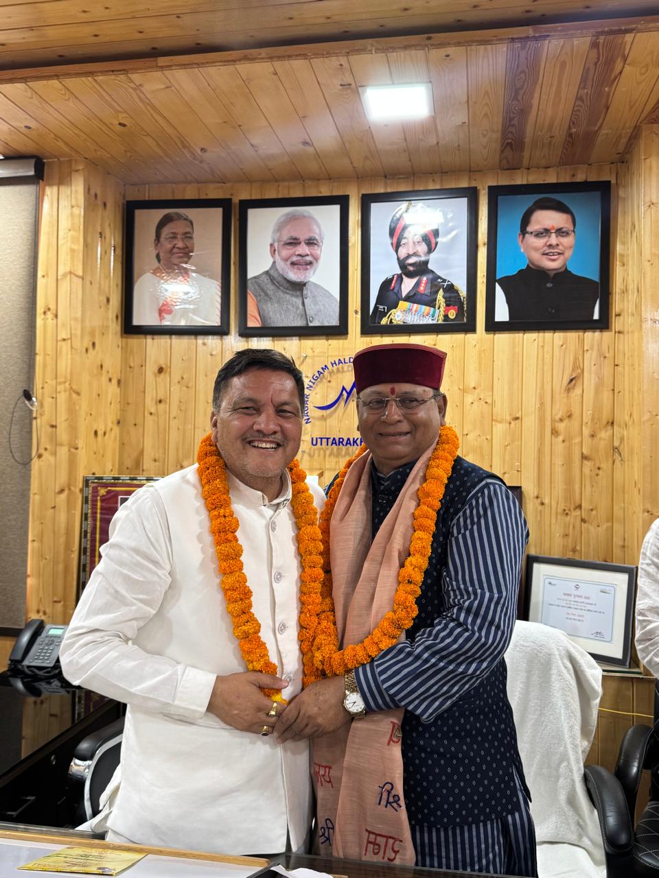 हल्द्वानी-काठगोदाम। नगर निगम हल्द्वानी-काठगोदाम स्थित महापौर कार्यालय में महापौर गजराज सिंह बिष्ट द्वारा उत्तराखंड सरकार में कैबिनेट मंत्री एवं नैनीताल जनपद के प्रभारी मंत्री खजान दास का भव्य एवं आत्मीय स्वागत किया गया। इस अवसर पर पार्षदगण, नगर निगम अधिकारी एवं गणमान्य नागरिक उपस्थित रहे।