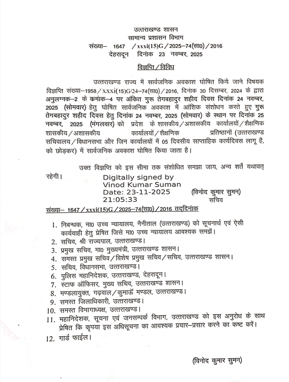 संशोधित आदेश पर उत्तराखंड के सचिव विनोद कुमार सुमन द्वारा डिजिटल हस्ताक्षर किए गए हैं। संशोधित अधिसूचना की प्रतियां सभी संबंधित प्रशासनिक विभागों, जिला अधिकारियों और वरिष्ठ अधिकारियों को अनुपालन हेतु भेज दी गई हैं।