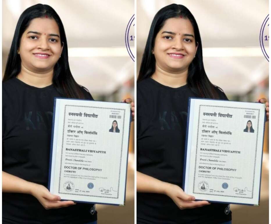 हल्द्वानी। चोरगलिया क्षेत्र की प्रतिभाशाली बेटी प्रीती चन्दोला ने वनस्थली विद्यापीठ, राजस्थान से रसायन विज्ञान में डॉक्टर ऑफ फिलॉसफी (Ph.D.) की उपाधि प्राप्त कर क्षेत्र का नाम गौरवान्वित किया है।