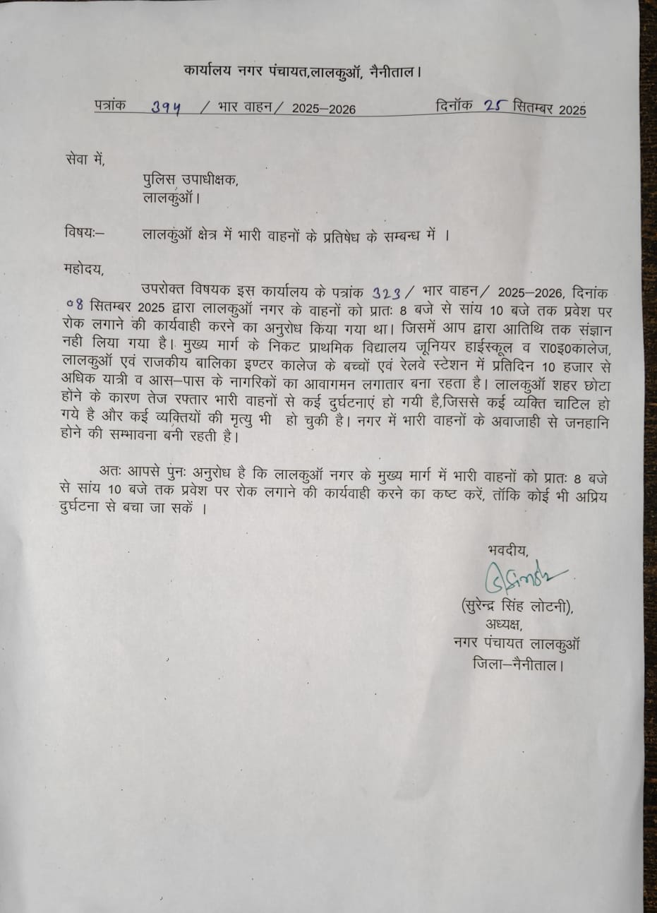 लालकुआं। नगर पंचायत अध्यक्ष सुरेंद्र लोटनी ने भार वाहन / 2025-2026, दिनांक ०४ सितम्बर 2025 द्वारा लालकुआँ नगर के वाहनों को प्रातः 8 बजे से सांय 10 बजे तक प्रवेश पर रोक लगाने की कार्यवाही करने का अनुरोध किया गया था।