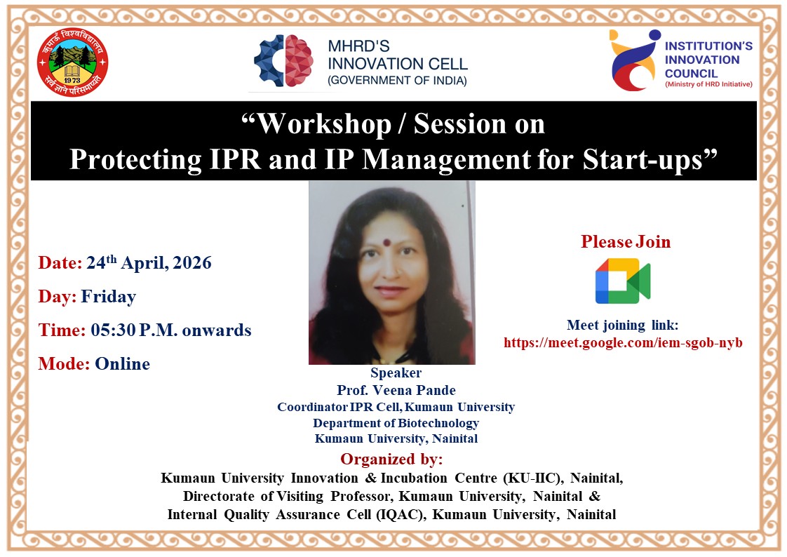 कुमाऊँ विश्वविद्यालय के इनोवेशन एवं इन्क्यूबेशन सेंटर द्वारा “प्रोटेक्टिंग आईपीआर एंड आईपी मैनेजमेंट” विषय पर एक महत्वपूर्ण व्याख्यान का आयोजन किया गया।