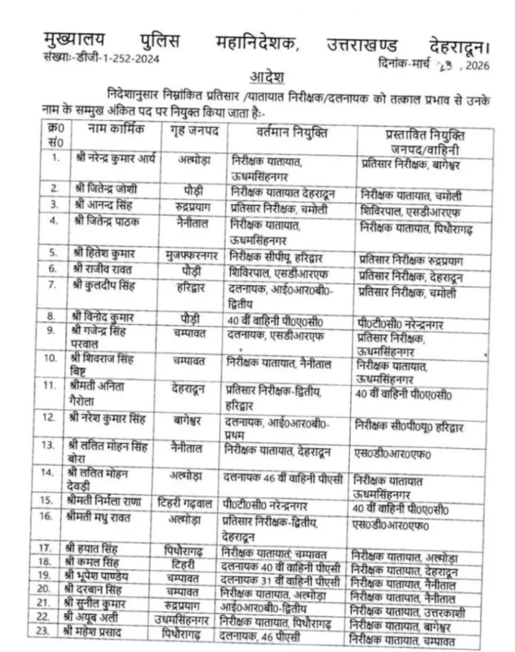 उत्तराखंड पुलिस मुख्यालय, देहरादून से जारी आदेश में राज्यभर में बड़ा प्रशासनिक फेरबदल किया गया है। पुलिस महानिदेशक कार्यालय के निर्देश पर 23 निरीक्षक, प्रतिसार निरीक्षक, यातायात निरीक्षक और दलनायकों के तबादले किए गए हैं। सभी को तत्काल प्रभाव से नई तैनाती स्थल पर कार्यभार ग्रहण करने के निर्देश दिए गए हैं।