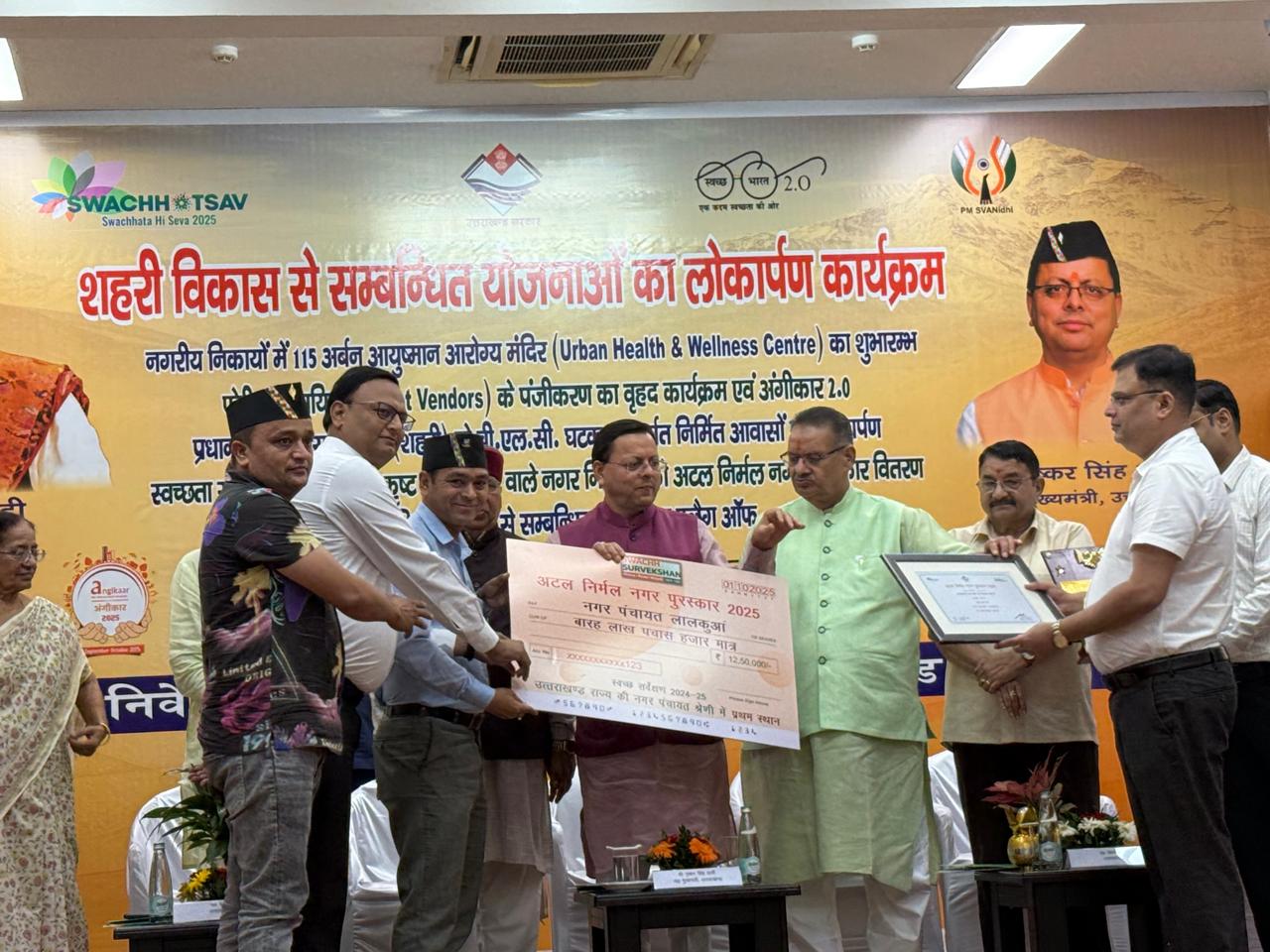 इसके पश्चात आज दिनांक 01.10.2025 को मुख्य सेवक सदन देहरादून में मा० अध्यक्ष, नगर पंचायत को पुष्कर सिंह धामी मा० मुख्यमंत्री, उत्तराखण्ड सरकार द्वारा अटल निर्मल पुरूस्कार वर्ष 2024-25 प्रदान कर पुरूस्कृत किया गया।