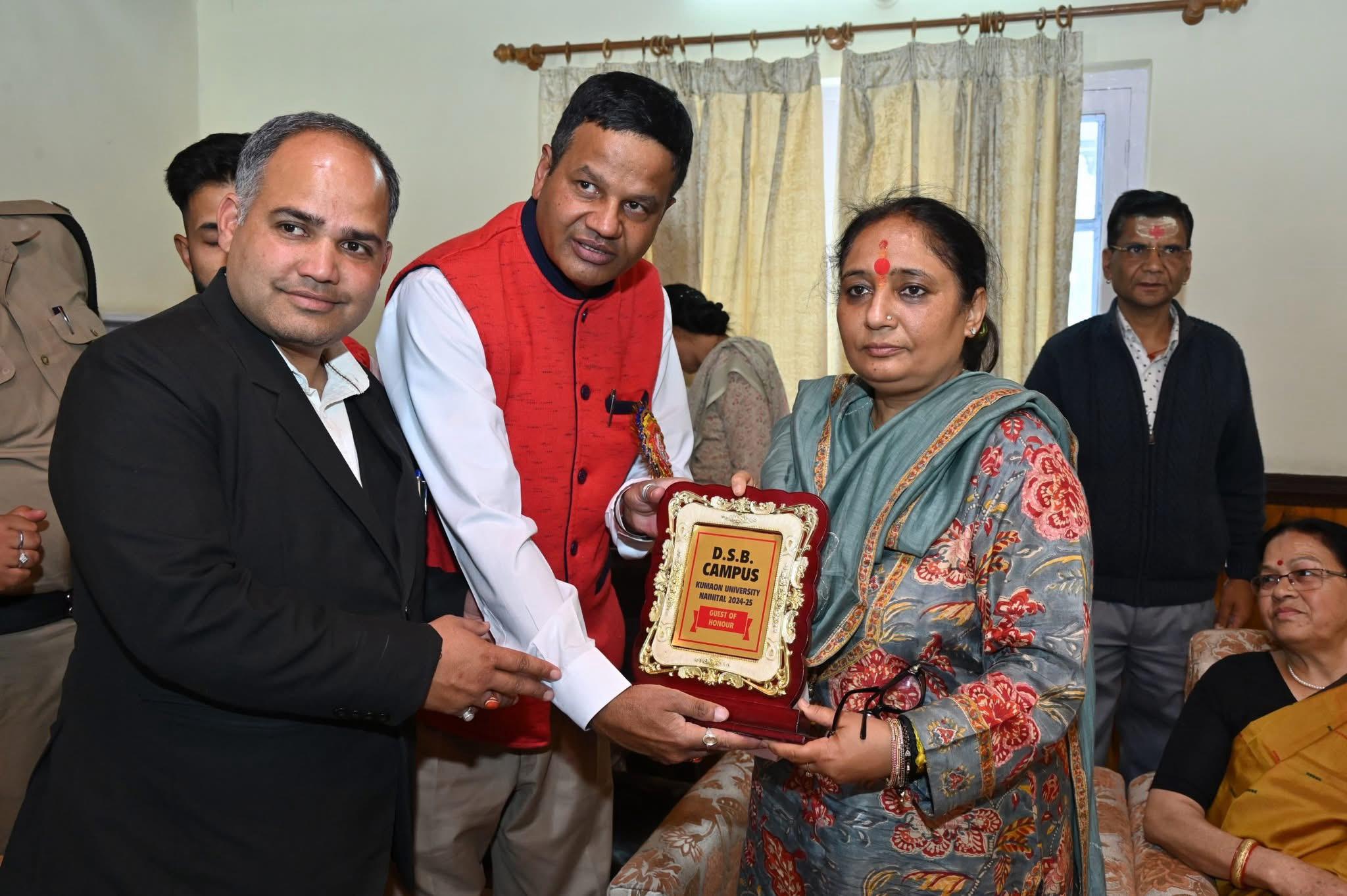 प्रॉफ ललित तिवारी नए विधान सभा अध्यक्ष को विश्वविद्यालय का प्रतीक चिन्ह ,कैप के साथ पुष्प गुच्छ भी भेट किया ।