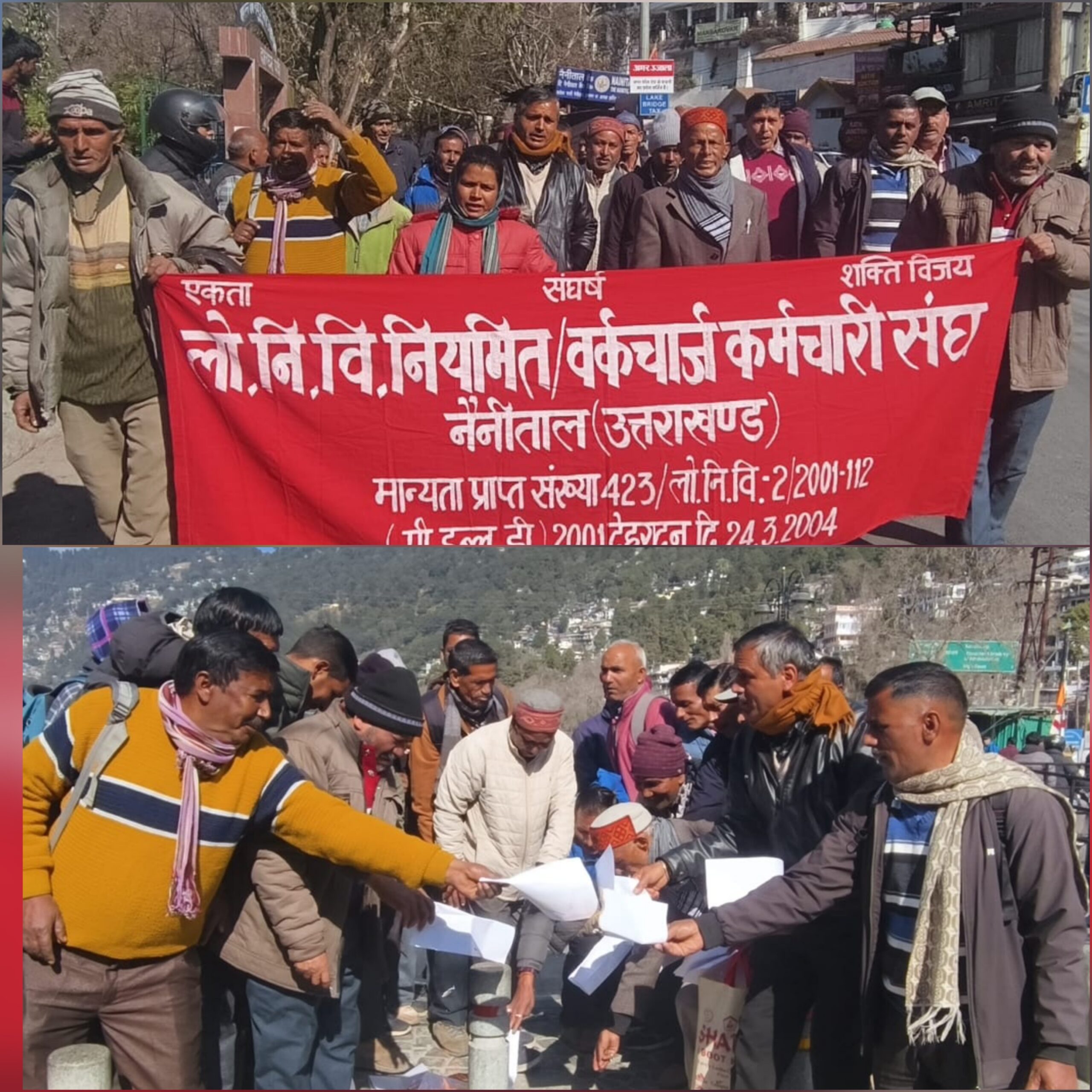 नैनीताल। लोक निर्माण विभाग के नियमित व वर्कचार्ज कर्मचारियों ने पेंशन से बाहर किए जाने वाले शासनादेश के खिलाफ आज तल्लीताल गांधी चौक में धरना प्रदर्शन किया।