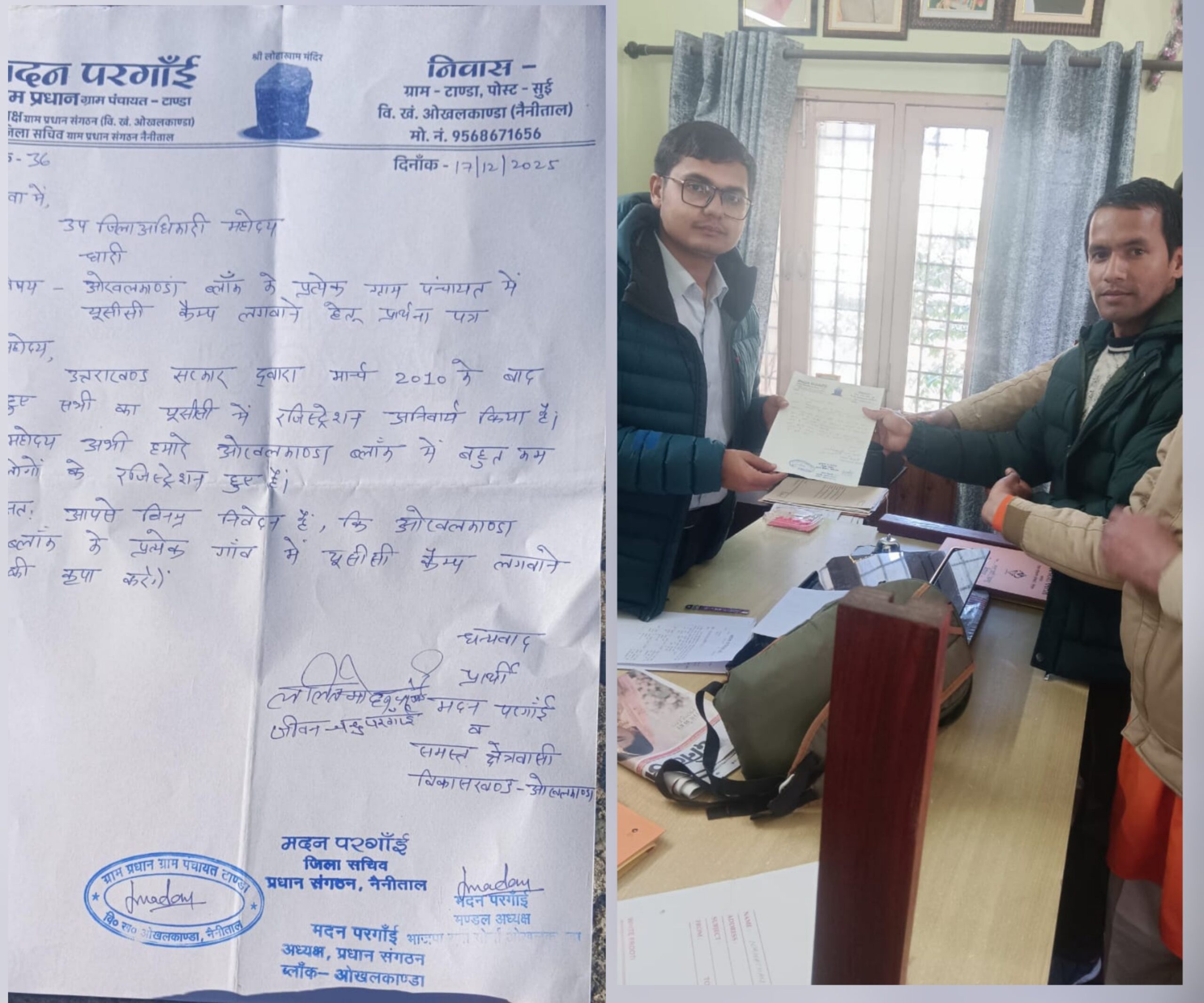 धारी। प्रधान संगठन अध्यक्ष ओखलकांडा मदन परगाॅई ने उप जिलाधिकारी धारी अंशुल भट्ट को ज्ञापन देकर ओखलकांडा ब्लॉक के समस्त ग्राम पंचायतों में यूजीसी कैंप लगवाने की मांग की।
