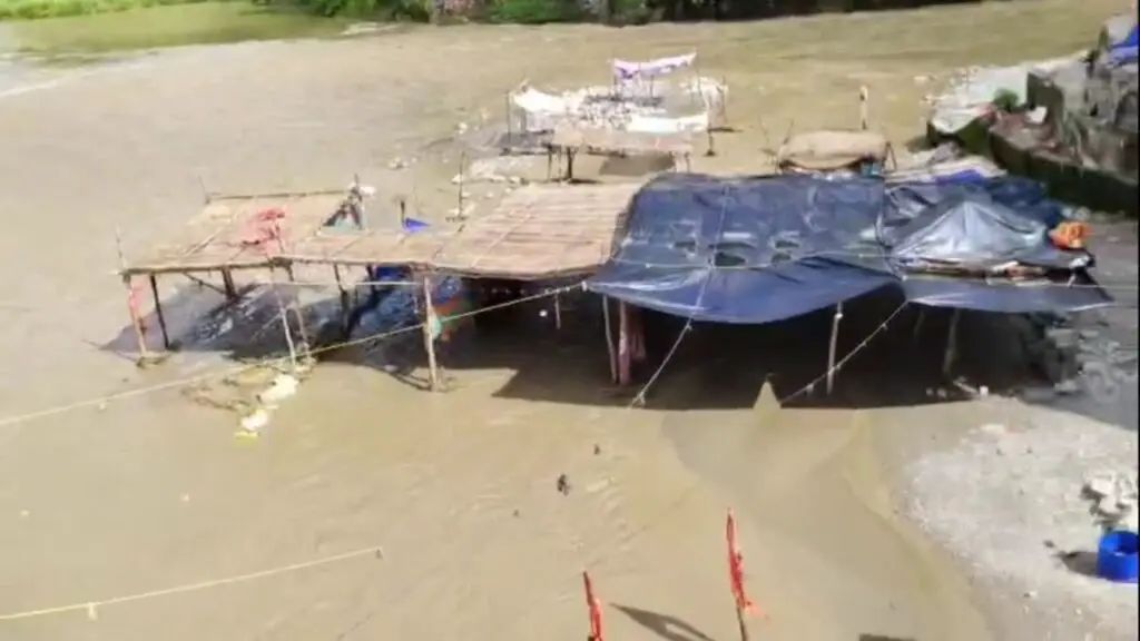 मौके पर मौजूद लोगों ने मोबाइल कैमरों में इस दृश्य को कैद किया, जिसमें नदी के तेज बहाव के साथ दुकानें बहती नजर आ रही हैं।