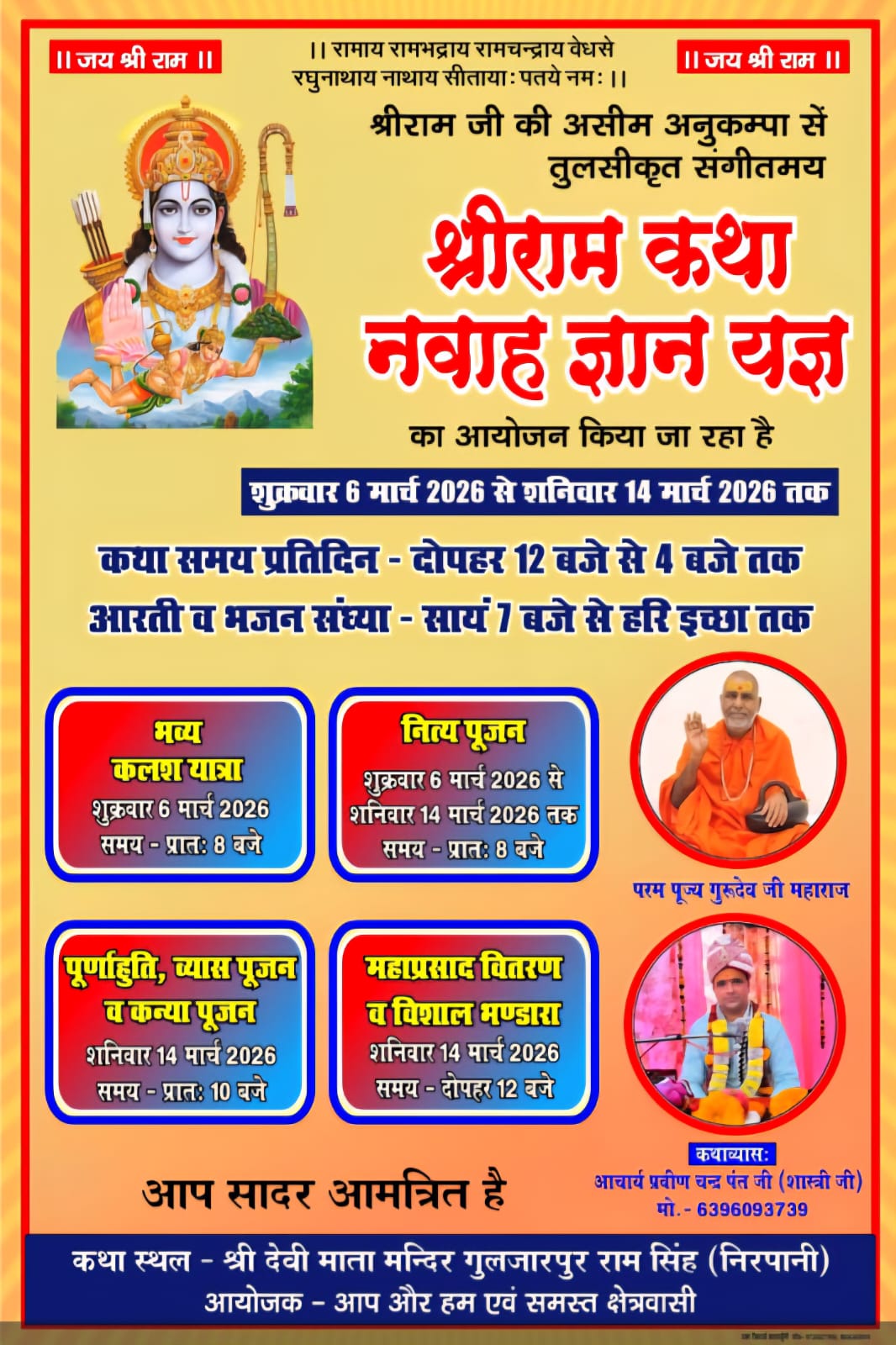 मन्दिर कमेटी के अध्यक्ष हयात सिंह मेहरा ने बताया कि ये श्री राम कथा 6 मार्च से लेकर 15 मार्च तक किया जायेगा। 15 मार्च को ही भंडारे के साथ कथा का समापन किया जाएगा।