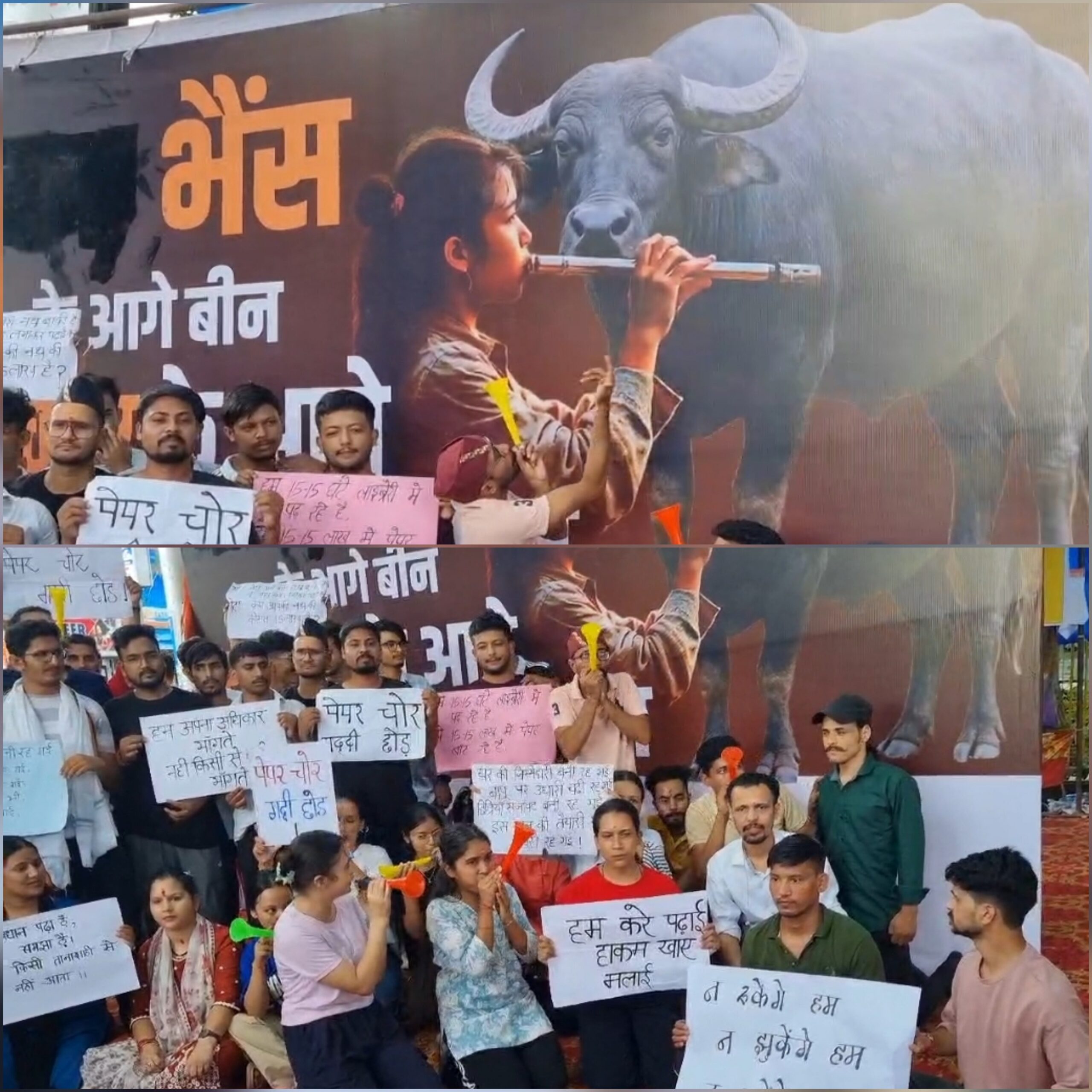 उन्होंने भैंस का पोस्टर लगाकर बीन बजाई और राज्य सरकार को जगाने का प्रयास किया। युवाओं ने धरना स्थल पर असल भैंस लाने की कोशिश की लेकिन पुलिस और प्रशासन ने उन्हें रोक दिया।