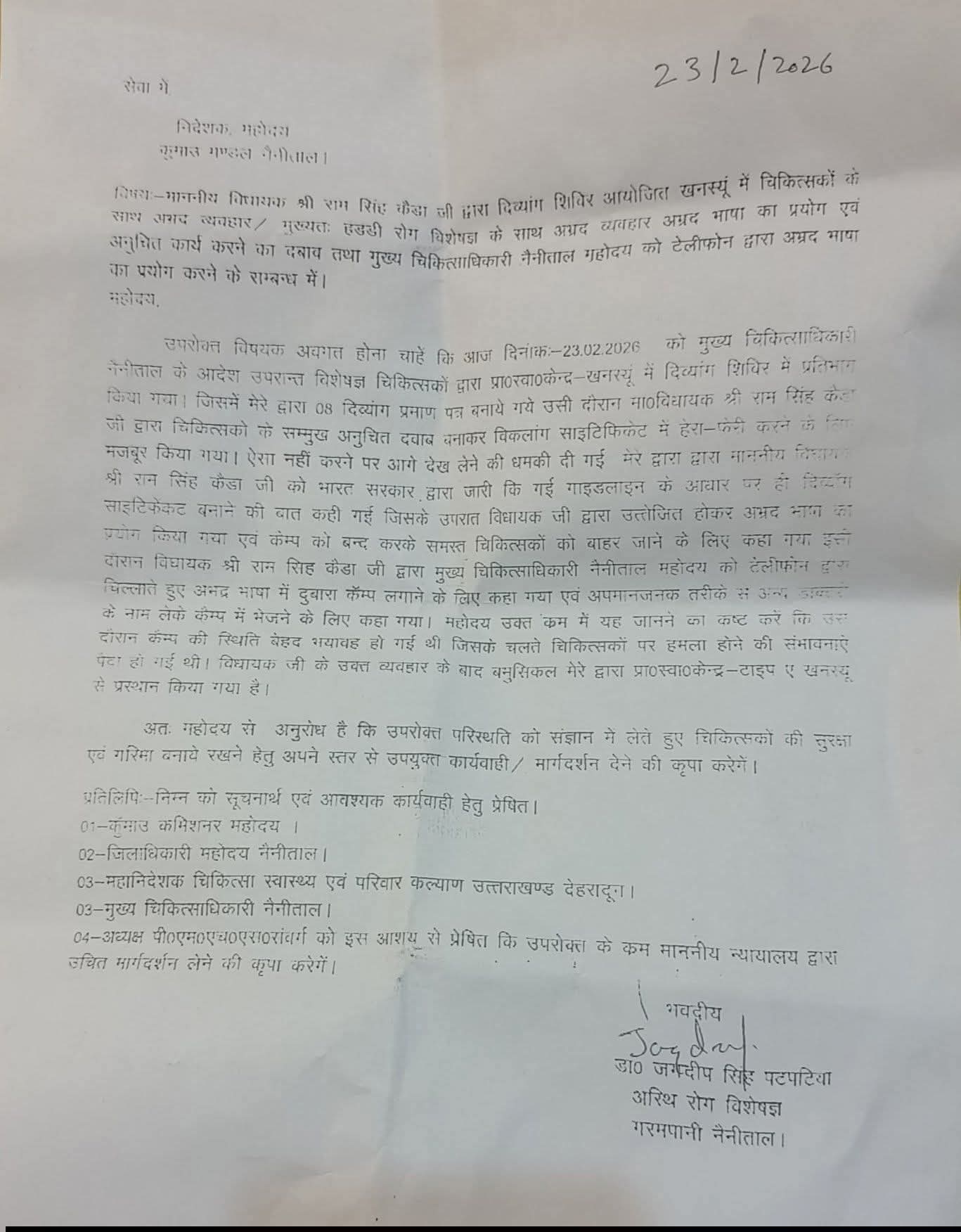शिविर में मेडिकल बोर्ड की टीम, जिसमें बेस चिकित्सालय हल्द्वानी के चिकित्सक शामिल थे, ने स्थानीय विधायक राम सिंह कैड़ा पर अभद्र व्यवहार और अनुचित दबाव बनाने का आरोप लगाया है।