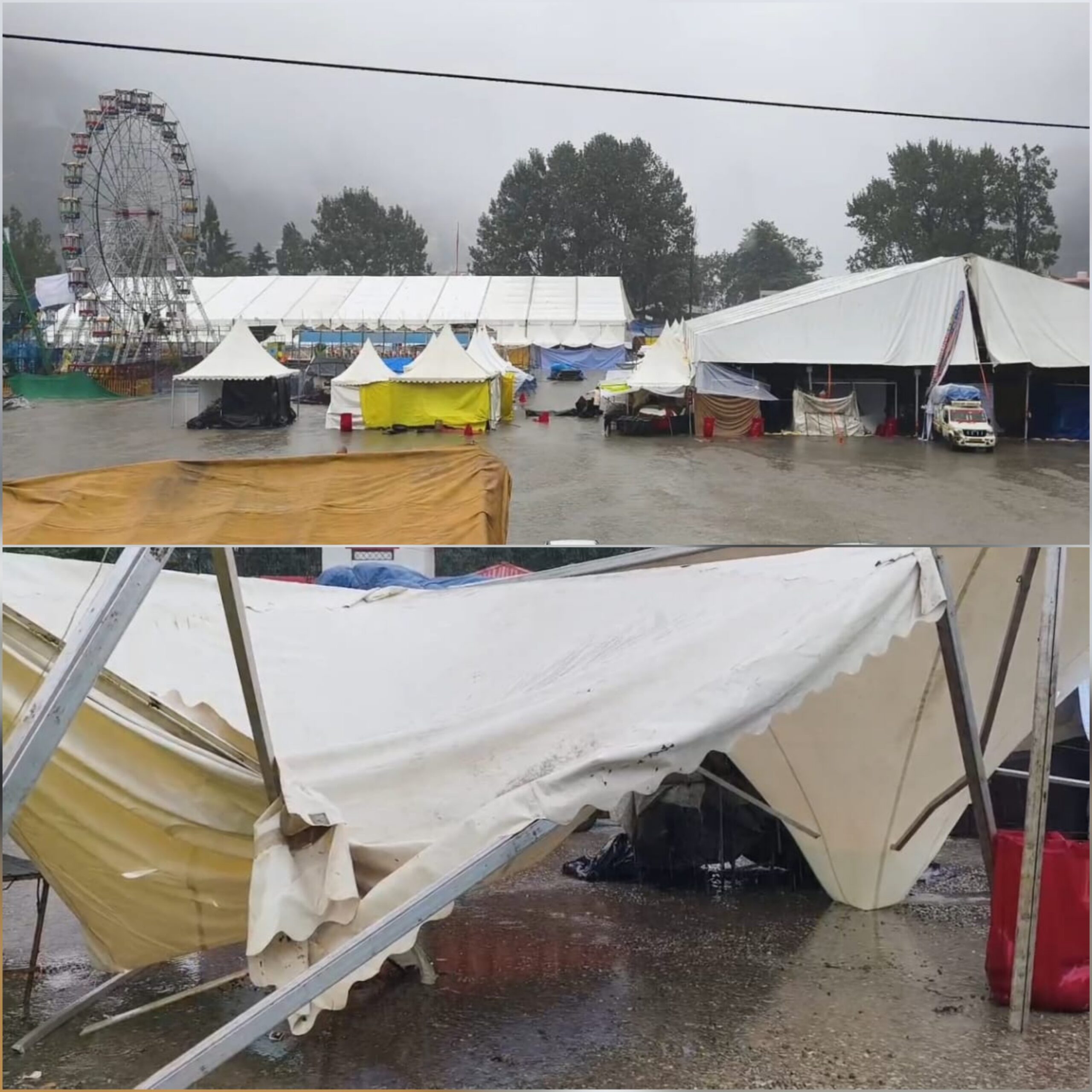 सोमवार से शुरू हुई बरसात आज मंगलवार को भी निरंतर जारी है। यहां इस वर्ष मैदान का समतलीकरण किया गया था और स्मार्ट डोम टैंट लगाकर मेले को सुंदर और व्यवस्थित बनाया गया था। बीते 24 घंटे में हुई 174 एम.एम. बरसात और तेज हवा ने मेले की हवा निकाल दी है।